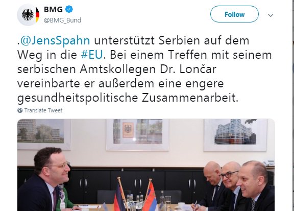 Немачки министар здравља: Подршка Србији на путу ка ЕУ