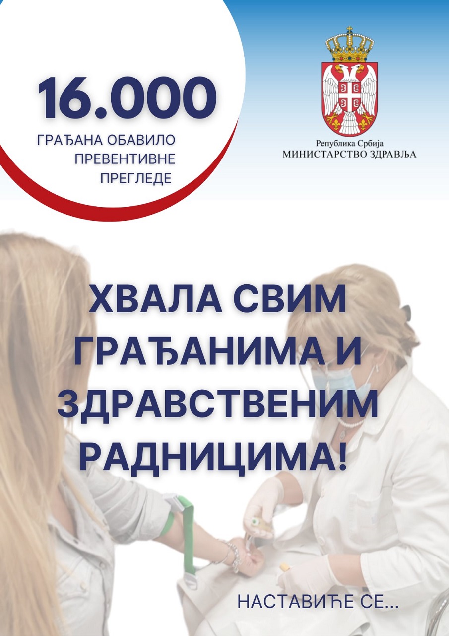 И У ЈУЛУ ВЕЛИКИ ОДЗИВ ГРАЂАНА НА АКЦИЈУ МИНИСТАРСTВА ЗДРАВЉА-ПРЕВЕНТИВНЕ ПРЕГЛЕДЕ ОБАВИЛО 16.000 ГРАЂАНА